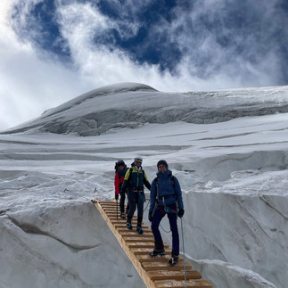 Avremmo proprio bisogno di muoverci e invece ci troviamo di fronte ad un po’ di coda per utilizzare la scala che supera il crepaccio terminale. Qui ci sentiamo delle vere bomber, ci diamo il tempo per salire così da procedere insieme, ultimi passaggi con la picca e siamo di nuovo in piedi per affrontare l’ultimo pezzetto. Ancora un traverso su cui fare attenzione per poi arrivare nuovamente su roccia. Siamo congelate, ma siamo proprio sotto la Madonnina! La vediamo!